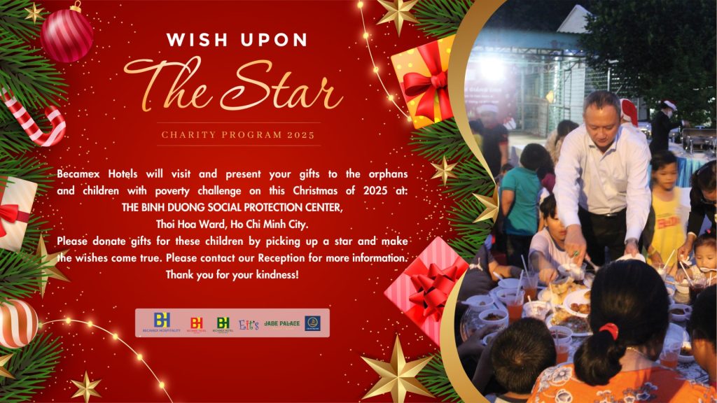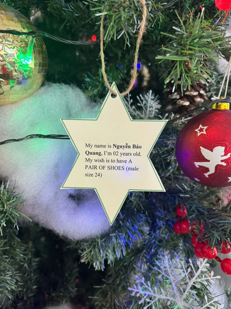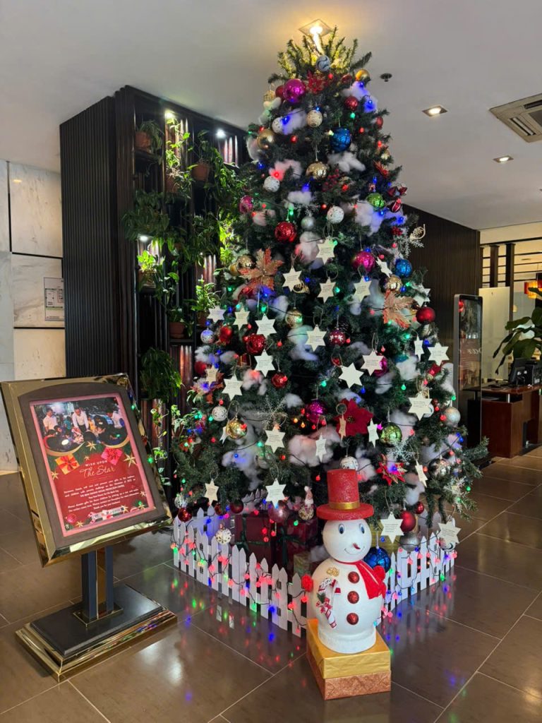 Mỗi dịp Giáng Sinh về, cây thông tại Khách sạn Becamex lại rực rỡ với những ngôi sao điều ước – nơi các em nhỏ khó khăn gửi gắm mong muốn của mình.